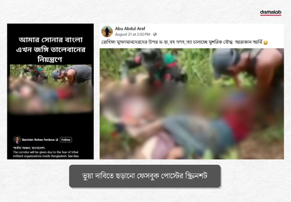 ছড়িয়ে পড়া ভিডিওতে দেখা যাচ্ছে, একজন সামরিক ও একজন বেসামরিক পোশাকধারী ব্যক্তি কয়েকজনকে ছুরিকাঘাতে হত্যা করছে। ভিডিওটি শেয়ার করে এক ফেসবুক ব্যবহারকারী লিখেছেন, “বাংলাদেশের ভিতরে আদিবাসী সশস্ত্র সংগঠনের ভয়ে করিডর দেওয়া হবে।” শেয়ার করা ঐ ভিডিওতে লেখা, “আমার সোনার বাংলা এখন জঙ্গি তালেবানের নিয়ন্ত্রণে।” পোস্টটি এখন পর্যন্ত ৭৩ হাজারের বেশিবার দেখা হয়েছে। অপরদিকে রোহিঙ্গা গণহত্যার দৃশ্য দাবি করে একই ভিডিও শেয়ার করতে দেখা গেছে বেশ কয়েকজন ব্যবহারকারীকে। একাধিক ফেসবুক ব্যবহারকারী (১, ২, ৩) লিখেছেন, “মায়ানমারে রোহিঙ্গা মুসলিমদের নৃশংসভাবে হত্যা করছে আরাকান আর্মিরা” কিংবা “আরা’কানে রো’হি’ঙ্গা মুসলিমদের হ’/ত্যা” (বানান অপরিবর্তিত)।