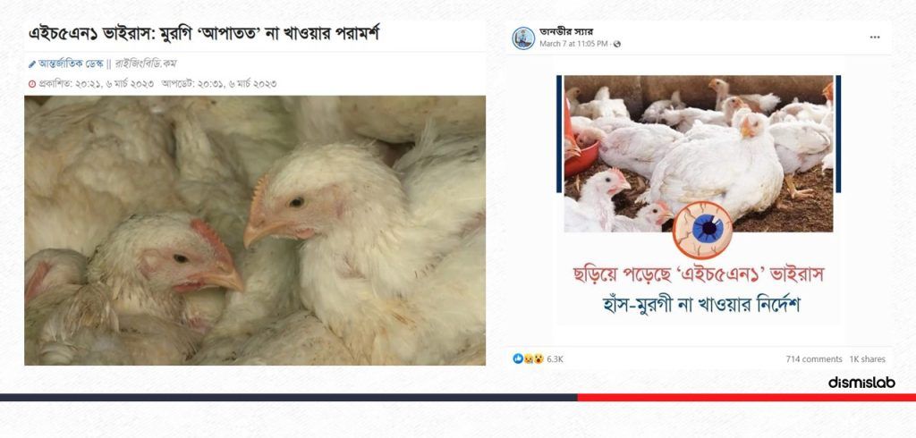 “ছড়িয়ে পড়েছে ‘এইচ৫এন১’ ভাইরাস। হাঁস-মুরগী না খাওয়ার নির্দেশ” লেখা ভাইরাল এসব পোস্টের সূত্র খোঁজ করতে গিয়ে কিছু গণমাধ্যমের সংবাদ সামনে আসে। যাচাইয়ে দেখা যায়, গত ৬ মার্চ জাগো নিউজ ও নিউজ২৪ বিডি ‘আপাতত মুরগি না খাওয়ার পরামর্শ বিশেষজ্ঞদের’ শিরোনামে সংবাদ প্রচার করে। একই দিনে রাইজিং বিডি ‘এইচ৫এন১ ভাইরাস: মুরগি ‘আপাতত’ না খাওয়ার পরামর্শ’ শিরোনামে একই সংবাদ প্রচার করে। তবে সবগুলো সংবাদই ভারতের ঝাড়খণ্ড প্রদেশ সংশ্লিষ্ট। ঝাড়খণ্ডে মুরগির এইচ৫এন১ ভাইরাস বা বার্ড ফ্লু ভাইরাস ছড়ানোয় সতর্কতা জারি করেছে দেশটির স্থানীয় সরকার।