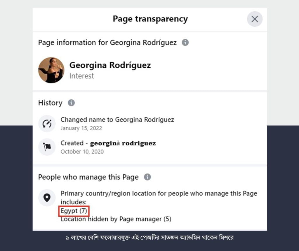 কিন্তু এই ফেসবুক পেজটি ভেরিফায়েড নয় এবং এটির ‘এবাউট আস’ সেকশনে দেখা যাচ্ছে, পেজটির অন্তত ৭ জন এডমিন মিশরে অবস্থান করছেন।