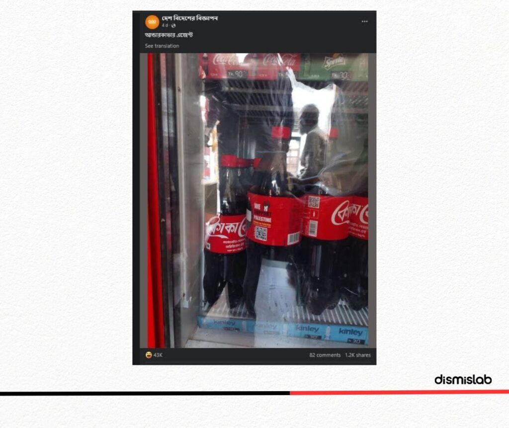 সম্প্রতি ফেসবুকে একাধিক অ্যাকাউন্ট থেকে একটি ছবি পোষ্ট করে বলা হচ্ছে, বয়কটের ফলে কোমল পানীয় ব্র্যান্ড কোকাকোলা লোকসানের মুখে পড়ে ফিলিস্তিনকে সমর্থন করতে বাধ্য হচ্ছে। ছবিটি রেফ্রিজারেটরে রাখা কিছু কোমল পানীয় বোতলের, যেগুলোর মধ্যে একটি বাদে স্পষ্টত সবকটিই কোকাকোলার বোতল। কোকাকোলার নাম দেখা যায় না এমন একমাত্র বোতলটিতে লেখা রয়েছে “উই সাপোর্ট প্যালেস্টাইন”। কিন্তু যাচাইয়ে দেখা গেছে ফিলিস্তিনকে সমর্থন করা বোতলটি কোকাকোলার নয়, মোজো নামে ভিন্ন একটি পানীয়র।