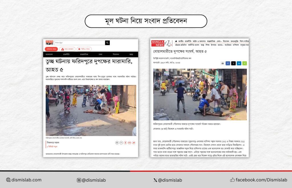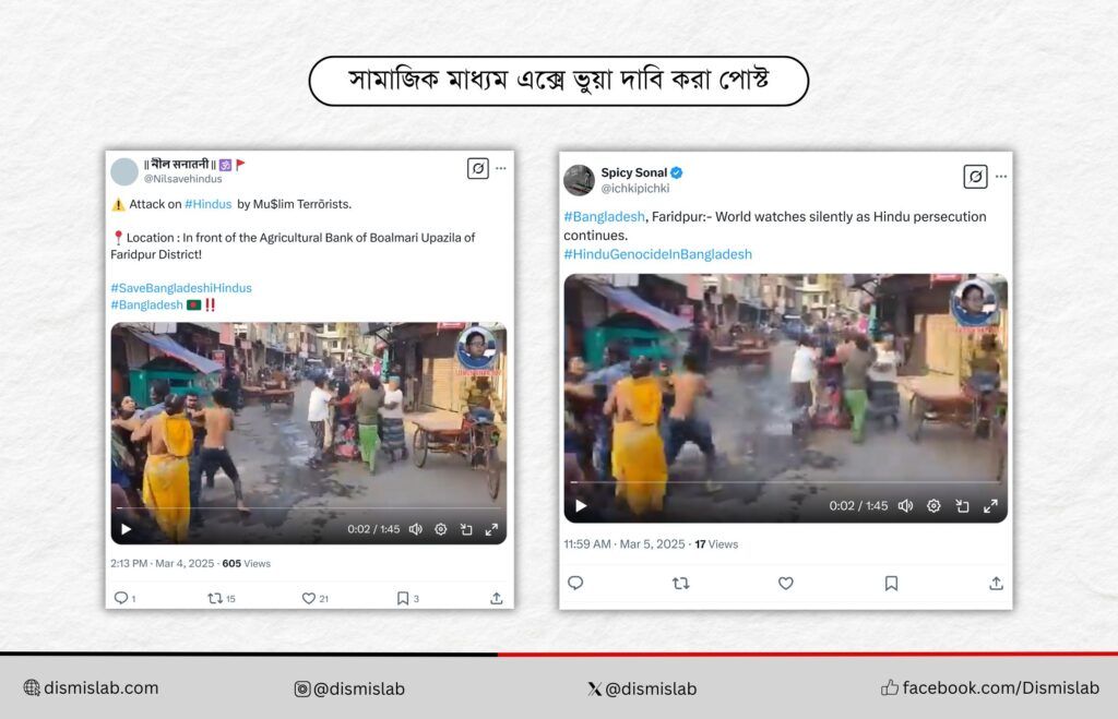 সামাজিক মাধ্যম এক্সের একাধিক পোস্টে (১, ২, ৩) সম্প্রতি বাংলাদেশের ফরিদপুর জেলার বোয়ালমারীতে সনাতন ধর্মাবলম্বীদের উপর হামলার ঘটনা ঘটেছে বলে দাবি করা হয়। নীল সনাতনী নামে একটি অ্যাকাউন্ট থেকে ভিডিওটি শেয়ার দিয়ে লেখা হয়েছে, “মুসলিম জঙ্গিরা হিন্দুদের ওপর হামলা করেছে। স্থান: ফরিদপুর জেলার বোয়ালমারী উপজেলার কৃষি ব্যাংকের সামনে”। হ্যাশট্যাগে বাংলাদেশে হিন্দু গণহত্যার উল্লেখ করেও ভিডিওটি শেয়ার করা হয়। স্পাইসি সোনাল এবং অ্যাংরি স্যাফরন নামের আরও দুটি অ্যাকাউন্ট থেকে লেখা হয়, “বাংলাদেশ, ফরিদপুর:- হিন্দু নিপীড়ন অব্যাহত আছে, নীরবে দেখছে বিশ্ব”।