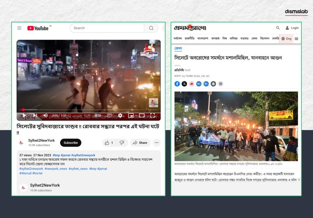 ভিডিওটির সূত্র যাচাই করতে গেলে দেখা যায় এটি ২০২৩ সালের ২৬ নভেম্বরে ঘটা সিলেটের একটি ঘটনার দৃশ্য। সিলেটে বাংলাদেশ জাতীয়তাবাদী দল (বিএনপি) ও সমমনা দলের ডাকা অবরোধ কর্মসূচি চলাকালে সিলেটের সুবিদবাজারে এই ভাংচুর ও অগ্নিসংযোগের ঘটনা ঘটে। সিলেট টু নিউ ইয়র্ক (Sylhet2NewYork) নামের একটি ইউটিউব চ্যানেল থেকে একটি ভিডিও পোস্ট করা হয় ২০২৩ সালের ২৭ নভেম্বরে। ভিডিওর শিরোনাম ছিল, “সিলেটের সুবিদবাজারে তান্ডব !! রোববার সন্ধ্যার পরপর এই ঘটনা ঘটে !!”। ভিডিওটির ৬ সেকেন্ড থেকে ভাংচুরের দৃশ্যের সাথে ভুল দাবিতে ছড়ানোর ভিডিওটির হুবহু মিল পাওয়া যায়। এই ঘটনায় প্রথম আলোর প্রকাশিত একটি প্রতিবেদনে বলা হয়, “অবরোধের সমর্থনে সিলেটে মশালমিছিল করেছেন বিএনপির নেতা-কর্মীরা। এ সময় কয়েকটি যানবাহন ভাঙচুর ও আগুন দেওয়ার ঘটনা ঘটে। রোববার সন্ধ্যা সাতটার দিকে নগরের সুবিদবাজার এলাকায় এ ঘটনা ঘটে।” অর্থাৎ, ভিডিওটি ভারতের পশ্চিমবঙ্গের নয় এবং পোস্টে করা দাবিগুলোর সঙ্গে ভিডিওটির কোন সম্পর্ক নেই।