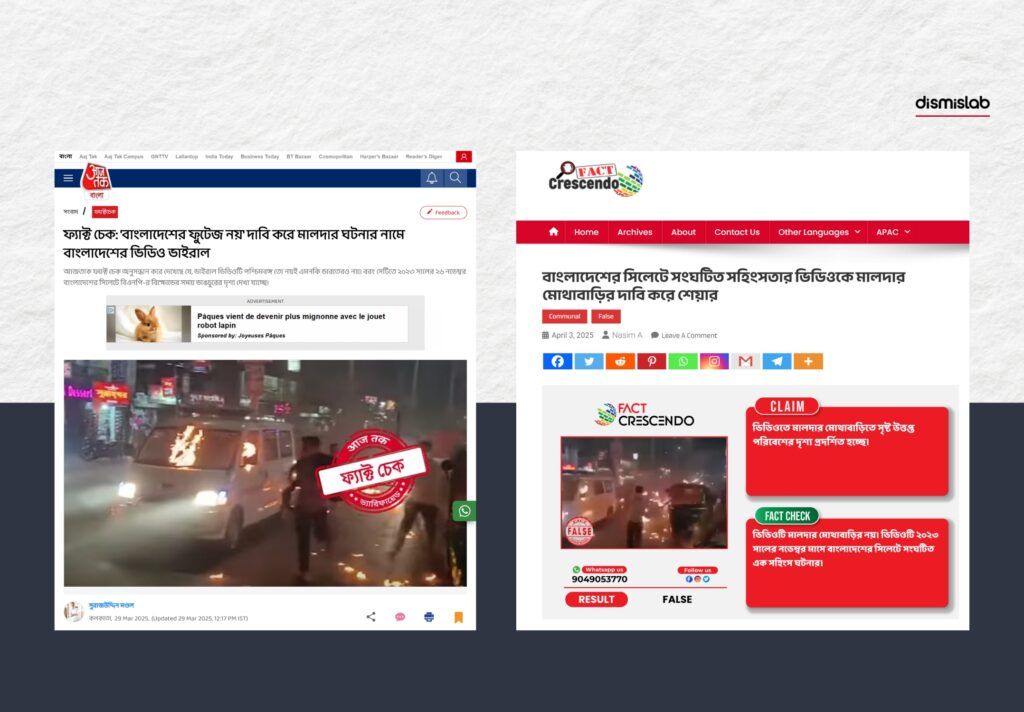 একই ভিডিও আবার ভারতের সামাজিক মাধ্যমে ছড়িয়েছে ভিন্ন দাবিতে। সেখানে বলা হয়েছে পশ্চিমবঙ্গের মালদহের মোথাবাড়িতে মুসলমানরা হিন্দুদের দোকানপাট ভাংচুর করেছে এবং যানবাহনে আগুন দিয়েছে। এ নিয়ে ফ্যাক্টচেক প্রতিবেদন প্রকাশ করেছে ভারতীয় তথ্যযাচাইকারী সংস্থা ফ্যাক্ট ক্রেসেন্ডো এবং সংবাদ মাধ্যম আজতাক বাংলা।
