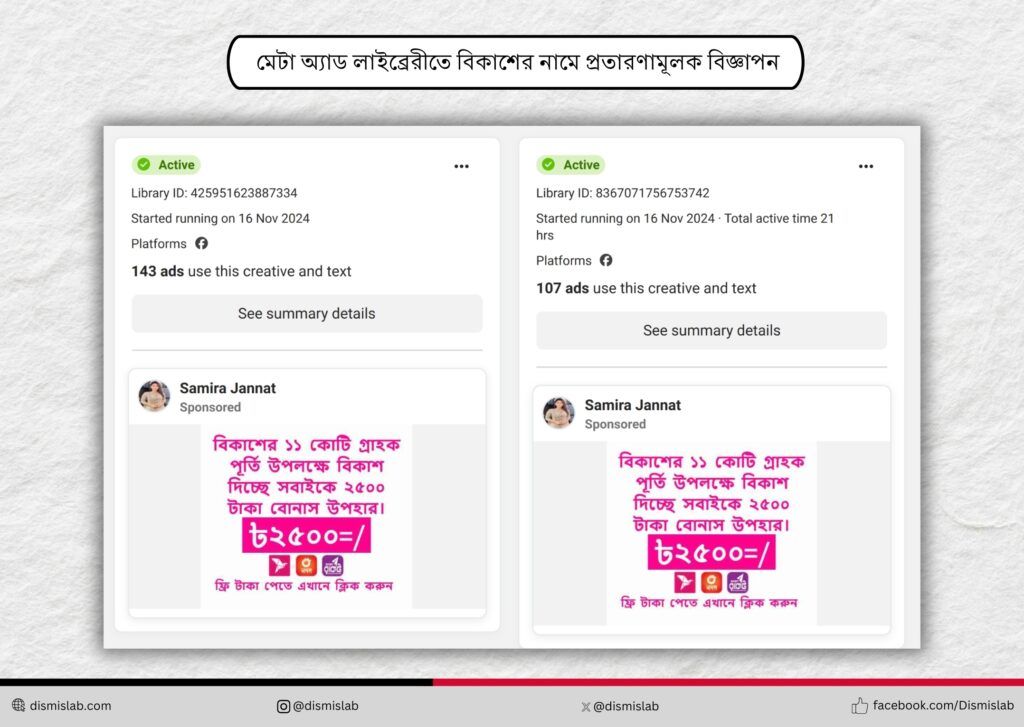 ১১ কোটি গ্রাহক পূর্তি উপলক্ষে বিকাশ সবাইকে ২৫০০ টাকা উপহার দিচ্ছে এমন দাবিতে একটি বিজ্ঞাপন চলতে দেখা যায় সামাজিক মাধ্যম ফেসবুকে। ১৭ নভেম্বর, মেটা অ্যাড লাইব্রেরিতে “২৫০০ টাকা উপহার” কিওয়ার্ড সার্চ করে একই ধরনের প্রায় ২৬৭টি সক্রিয় বিজ্ঞাপন চলতে দেখা যায়। যেসব পেজ থেকে এই বিজ্ঞাপনটি চালানো হয়েছে সেসব পেজে এই বিজ্ঞাপন সংশ্লিষ্ট কোন পোস্ট পাওয়া যায় না।