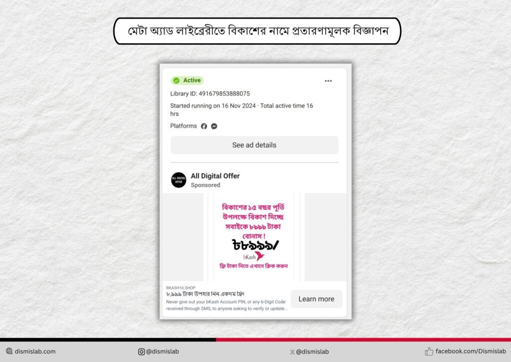 বিকাশের ১৫ বছর পূর্তি উপলক্ষে ৮,৯৯৯ টাকা উপহার দেওয়ার হচ্ছে– এমন আরেকটি বিজ্ঞাপনও দেখা গেছে ফেসবুকে। এই বিজ্ঞাপনের মাধ্যমে প্রতারণার ধরনও প্রায় একই রকম। এখানেও বিকাশের অনুকরণে তৈরি একটি সাইটে একই ধরনের তথ্য জানতে চাওয়া হয়। তথ্য জমা দিলে নিয়ে যায় আমেনা স্টোর নামের একটি পেমেন্ট গেটওয়েতে এবং একই পদ্ধতিতে টাকা কেটে নেয়। মেটায় এই বিজ্ঞাপন দেওয়া পেজটির নাম অল ডিজিটাল অফার। পেজটি খোলা হয়েছে নভেম্বরের ১৪ তারিখে। একই দিনে পেজ থেকে এই প্রতারণামূলক ওয়েবসাইটের লিংক শেয়ার করা হয়। পোস্টটিতে একজন ব্যবহারকারী লিখেন, “আমি সঠিক ইনফরমেশন দিয়েই ফরম ফিলাপ করছি বাট আমার টাকা তো আসে নাই উলটা আমার ব্যালেন্সের টাকা কাইটা নিয়া গেছে।” অর্থাৎ, এই ধরনের পোস্টের মাধ্যমে অনেকেই প্রতারণার শিকার হচ্ছেন।