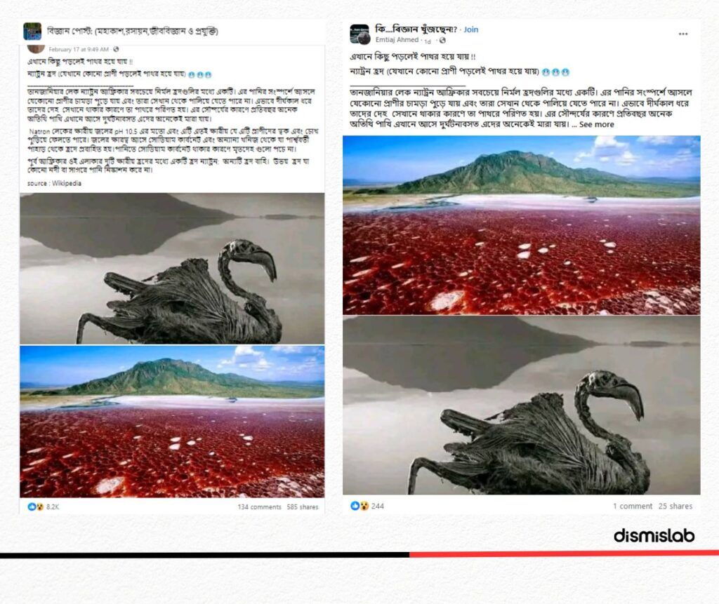 পূর্ব আফ্রিকার তানজানিয়ায় অবস্থিত ন্যাট্রন লেকের পানির সংস্পর্শে এসে জীবন্ত প্রাণী পাথরে পরিণত হয় দাবি করে কিছু পোস্ট শেয়ার করা হয়েছে ফেসবুকে (১, ২, ৩, ৪, ৫)। এমন দাবিতে বিভিন্ন সময় সংবাদ প্রকাশিত হয়েছে বাংলাদেশ ও ভারতের গণমাধ্যমেও (১, ২, ৩, ৪, ৫)। তবে যাচাইয়ে দেখা যায় ন্যাট্রন লেক সম্পর্কিত এসব তথ্য সঠিক নয়। ন্যাট্রন লেকের পানির স্পর্শে এসেই প্রাণীরা পাথর বা মমিতে রূপান্তরিত হয় না, বরং এই লেকে রয়েছে বিভিন্ন প্রাণীর বিচরণ ও নিজস্ব বাস্তুব্যবস্থা। মূলত ক্ষার ও লবণ পানির প্রভাবে লেকের চারপাশে মৃত প্রাণীদের দেহ দীর্ঘ সময় সংরক্ষিত থাকে।