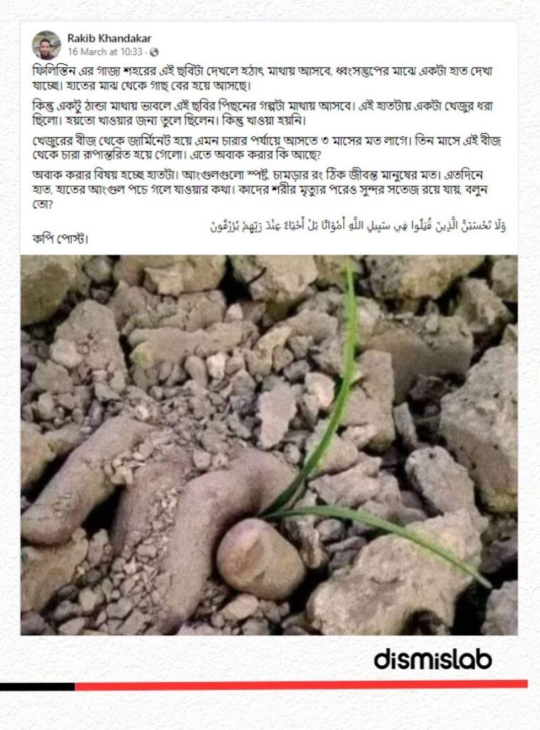 ধ্বংসস্তুপ ছুঁয়ে বের হয়ে আছে একটি হাত। আঙুলের ফাঁক গলিয়ে ডানা মেলেছে দুই পাতার কচি চারা। সামাজিক যোগাযোগ মাধ্যমে ছবিটি প্রচার করে বলা হচ্ছে, এ দৃশ্য ফিলিস্তিনের গাজার। যাচাইয়ে দেখা যায় ছবিটি অন্তত আট বছরের পুরোনো। এর আগে ভিন্ন সময়ে ছবিটিকে “সিরিয়ার শহীদ”, “লেবানন বিস্ফোরণে নিহত ব্যক্তির হাত থেকে অঙ্কুরিত গমের চারা” হিসেবে ব্যাখ্যা দেওয়া হয়েছে, আফগানিস্তানেরও কেউ কেউ বলতে চেয়েছেন এটা তাদের দেশেরই কোনো ছবি। কেউ কেউ খোঁজার চেষ্টা করেছেন অলৌকিকত্ব। যাচাইয়ে দেখা গেছে, কোনো দাবিরই কোনো তথ্য-প্রমাণ নেই, অনুপস্থিত বিশ্বস্ততার উপাদান। এ নিয়ে সম্প্রতি একটিসহ আগে আরো দুইবার ফ্যাক্টচেক হয়েছে।