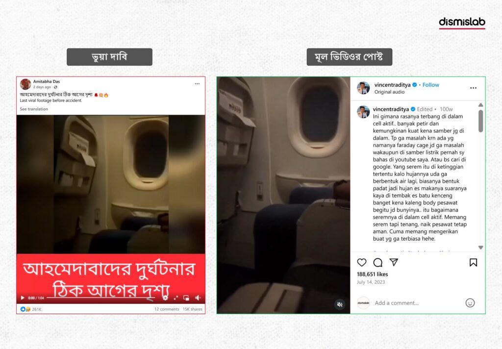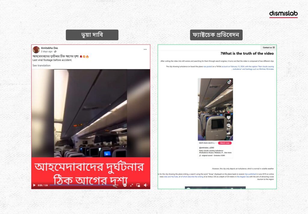 অর্থাৎ, পুরোনো তিনটি ঘটনার আলাদা ফুটেজ কেটে নিয়ে তা সম্পাদনা করে ফেসবুকে ছড়িয়ে দেওয়া হয়েছে সাম্প্রতিক আহমেদাবাদ বিমান দুর্ঘটনার ঠিক আগের দৃশ্য দাবিতে, যা সত্য নয়।