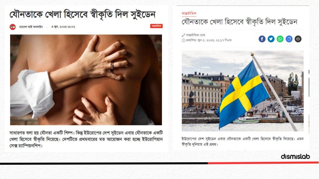 সুইডেন যৌনতাকে খেলা হিসেবে স্বীকৃতি দিয়েছে এবং প্রথমবারের মতো সেখানে সেক্স চ্যাম্পিয়নশিপ আয়োজিত হতে যাচ্ছে– এমন একটি সংবাদ সম্প্রতি প্রকাশিত হয়েছে বাংলাদেশের কয়েকটি সংবাদমাধ্যমে (১, ২, ৩)। ইউটিউব ও ফেসবুকের কিছু পেজেও (১, ২) এমন তথ্য প্রচারিত হতে দেখা যায়। তবে ডিসমিসল্যাবের যাচাইয়ে দেখা গেছে, সুইডেন যৌনতাকে খেলা হিসেবে স্বীকৃতি দেয়নি এবং এমন কোনো চ্যাম্পিয়নশিপও সেখানে আয়োজিত হচ্ছে না।