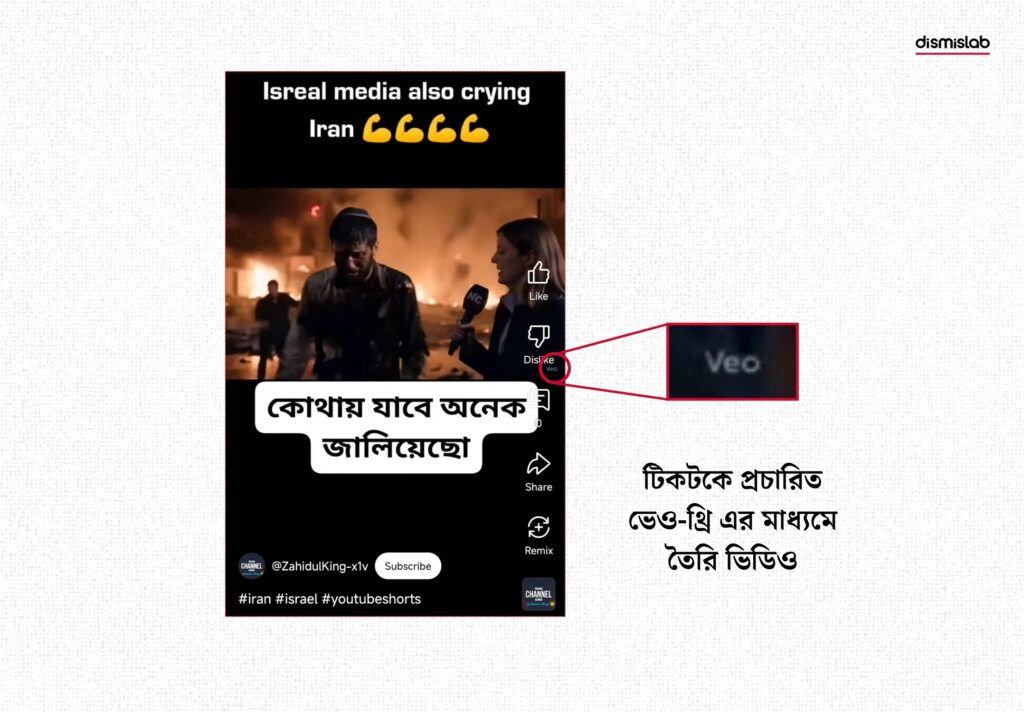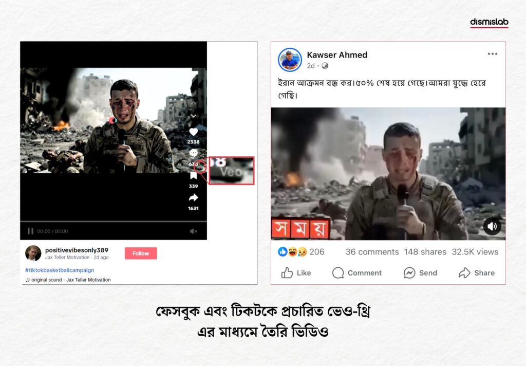 সামাজিক মাধ্যম ফেসবুকে পোস্ট হওয়া একটি ভিডিওতে দেখা যাচ্ছে সশস্ত্র বাহিনীর পোশাক পরে এক ব্যক্তি বুম হাতে কথা বলছেন। পোস্টগুলোর ক্যাপশনে লেখা, “ইরান আক্রমন বন্ধ কর।৫০% শেষ হয়ে গেছে।আমরা যুদ্ধে হেরে গেছি।” ৮ সেকেন্ডের এই ভিডিওর ব্যক্তিটিকে ইংরেজি ভাষায় বলতে শোনা যাচ্ছে, “ইরান! আমরা অনুরোধ করছি। দয়া করে আক্রমন থামাও। ইসরায়েলের অর্ধেক ধ্বংস হয়ে গেছে। আমরা আত্মসমর্পণ করছি। দয়া করে এই ধ্বংসযজ্ঞ থামাও।” কথা বলতে থাকা ব্যক্তিটির পেছনে ধ্বংসস্তুপ দেখা যাচ্ছে। ভিডিওটিতে গণমাধ্যম সময় টিভির লোগোও দেখা যায়। একই ভিডিও পোস্ট হতে দেখা যায় বিভিন্ন ফেসবুক পেজ এবং গ্রুপেও (১, ২, ৩, ৪, ৫)।