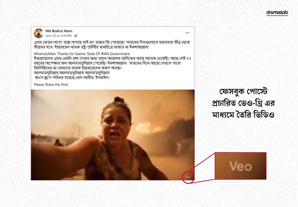 ফেসবুকে শেয়ার করা আরেকটি ভিডিও সামনে আসে ডিসমিসল্যাবের। ভিডিওটির ক্যাপশনে লেখা, “এখন কেমন লাগে? মজা লাগছে তাই না? মজার কি পেয়েছো? সামনের দিনগুলোতে ভয়াবহতা তীব্র থেকে তীব্রতর হবে। ইজরায়েল নামক রষ্ট্র পৃথিবীর মানচিত্রে থাকবে না ইনশাআল্লাহ!” ভিডিওটিতে দেখা যাচ্ছে একজন নারী দৌড়াচ্ছেন এবং আর্তনাদ করছেন। দৌড়াতে থাকা নারীর পেছনে বিস্ফোরণ হতে দেখা যাচ্ছে ভিডিওটিতে। ভিডিওটি আকার পরিবর্তন করে আরও পোস্ট পাওয়া যায় সামাজিক মাধ্যমে।