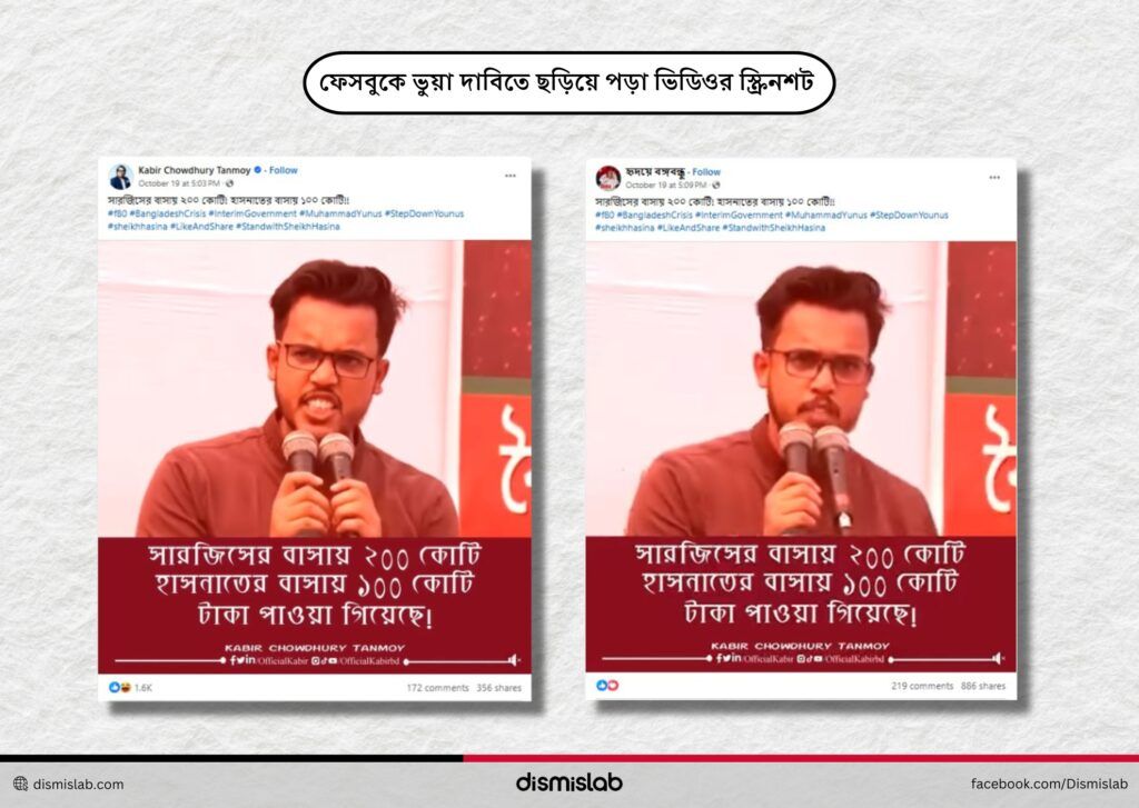 সম্প্রতি “সারজিসের বাসায় ২০০ কোটি! হাসনাতের বাসায় ১০০ কোটি!!”– দাবিতে ইউটিউব ও ফেসবুকে (১, ২, ৩, ৪, ৫, ৬) ৪৬ সেকেন্ডের একটি ভিডিও ছড়াতে দেখা যায়। ভিডিওটিতে বৈষম্যবিরোধী ছাত্র আন্দোলনের কেন্দ্রীয় সমন্বয়ক তরিকুলকে মাইক হাতে বক্তৃতায় বলতে শোনা যায়, “আমাদের কেউ দাবায় রাখতে পারবে না। চতুর্দিক থেকে ষড়যন্ত্র করা হচ্ছে। সারজিসের বাসায় ২০০ কোটি টাকা পাওয়া গিয়েছে। হাসনাতের বাসায় ১০০ কোটি টাকা পাওয়া গিয়েছে। যে অবিশ্বাসের রাজনীতি শুরু করা হয়েছে সে রাজনীতির বিরুদ্ধে আমাদের সচেতন থাকতে হবে। আমরা অন্তর্বর্তীকালীন সরকারকে বলব আপনারা উপদেষ্টা পদ আপনারা ছেড়ে দিন। আড়াই মাস হয়ে গিয়েছে সবজির দাম বেড়েছে। বাজারে নিত্য প্রয়োজনীয় দ্রব্যমূল্যের দাম বেড়েছে। তাহলে অন্তর্বর্তীকালীন সরকারকে দিয়ে আমরা কি করব? তাই আমরা বলতে চাই, আমাদের সজাগ থাকতে হবে। শেখ হাসিনা সরকার বারে বারে দরকার। ঠিক কি না?” সবগুলো ভিডিওর ভেতরের ক্যাপশনে ইংরেজিতে কবির চৌধুরী তন্ময়ের নাম উল্লেখ রয়েছে। এ প্রতিবেদনটি লেখা পর্যন্ত কবির চৌধুরী তন্ময় নামের একটি ভেরিফায়েড আইডি থেকে ছড়ানো মূল ভিডিওটি ফেসবুকে ২৬ হাজারের বেশিবার দেখা হয়েছে।