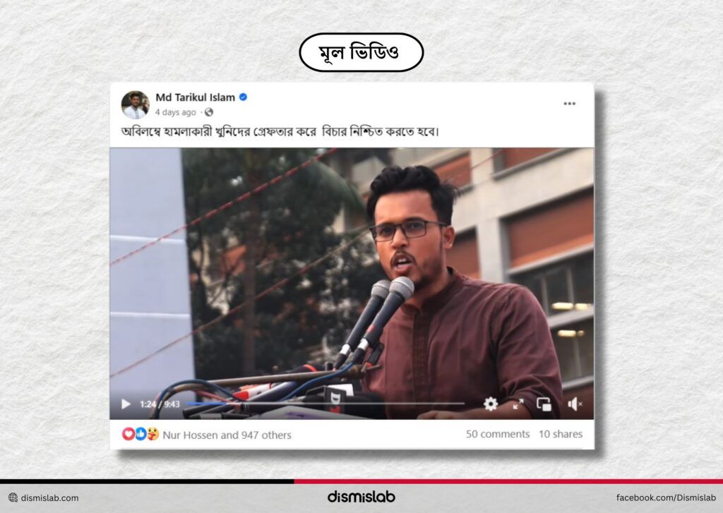 ভিডিওটি যাচাই করতে গিয়ে বৈষম্যবিরোধী ছাত্র আন্দোলনের কেন্দ্রীয় সমন্বয়ক ও স্বাস্থ্য বিষয়ক কেন্দ্রীয় উপকমিটির সদস্যসচিব মোঃ তরিকুল ইসলামের মূল বক্তব্যের ভিডিও খুঁজে পায় ডিসমিসল্যাব। গত ১৮ অক্টোবর, বৈষম্যবিরোধী ছাত্র আন্দোলন, বৃহত্তর মিরপুর কর্তৃক আয়োজিত এক মতবিনিময় সভায় তিনি এ বক্তব্যটি রাখেন। তরিকুলের ভেরিফায়েড ফেসবুক প্রোফাইলে তার মূল বক্তব্যের দীর্ঘ ৯ মিনিটের একটি ভিডিও খুঁজে পাওয়া যায়।