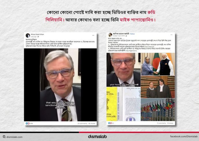 সামাজিক মাধ্যমে ফেসবুকে (১, ২, ৩, ৪) একাধিক পোস্টে একটি ভিডিও ও ছবিসহ দাবি করা হয় সুইজারল্যান্ড ইন্টারন্যাশনাল কোর্ট অফ জাস্টিসে ড. মুহাম্মদ ইউনূসের বিরুদ্ধে মামলার বিষয়ে সরাসরি ব্রিফিং করেছেন সুইজারল্যান্ডের আইনজীবী মাইক পাপানতোনিও। এছাড়া শেখ হাসিনার হয়ে এই মামলা লড়বেন মার্ক শেরম্যান নামক একজন আইনজীবী। পোস্টের ক্যাপশনে লেখা হয়, “রাখে আল্লাহ মারে কে……… একসাথে শুরু হলো ভারতের ট্রাভেল ডকুমেন্ট পাশ পেয়েছেন প্রধানমন্ত্রী শেখ যা দিয়ে তিনি বিশ্ব ভ্রমন করতে পারবেন। ২। সুইজারল্যান্ড ইন্টারন্যাশনাল কোর্ট অফ জাস্টিসে লইয়ার নিয়োগ করেছেন প্রধানমন্ত্রী শেখ হাসিনা ইতিমধ্যে মামলাটি লড়বেন সুইজারল্যান্ডের বিখ্যাত লইয়ার Mark Sherman ৩। ইন্টারন্যাশনাল কোর্ট অফ জাস্টিসে ডা: ইউনুসের বিরুদ্ধে মামলার বিষয়ে সরাসরি ব্রিফিং করছেন সুইজারল্যান্ডের আইনজীবী Mike Papantonio”। আরেকটি পোস্টে ভিডিওটি সংযুক্ত করে দাবি করা হয় সুইজারল্যান্ডের আইনজীবী রুডি গিলিয়ানি এই মামলা লড়ছে।