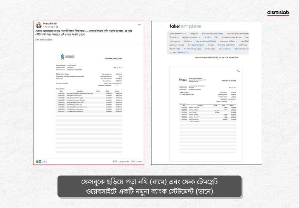 নথিটির সত্যতা যাচাইয়ে, একই ব্যাংকের দুজন প্রকৃত হিসাবধারীর ব্যাংক স্টেটমেন্টের প্রিন্ট ও অনলাইন বিবরণীর সঙ্গে ফেসবুকের নথিটি তুলনা করে দেখে ডিসমিসল্যাব। দেখা যায়, সেগুলোর সঙ্গে ছড়িয়ে পড়া বিবরণীর কাঠামোগত কোনো মিল নেই। অর্থাৎ, অভিনেত্রী শাওনের নামে ছড়িয়ে পড়া স্ট্যান্ডার্ড চার্টার্ড ব্যাংকের এই হিসাব বিবরণী আসল নয়।