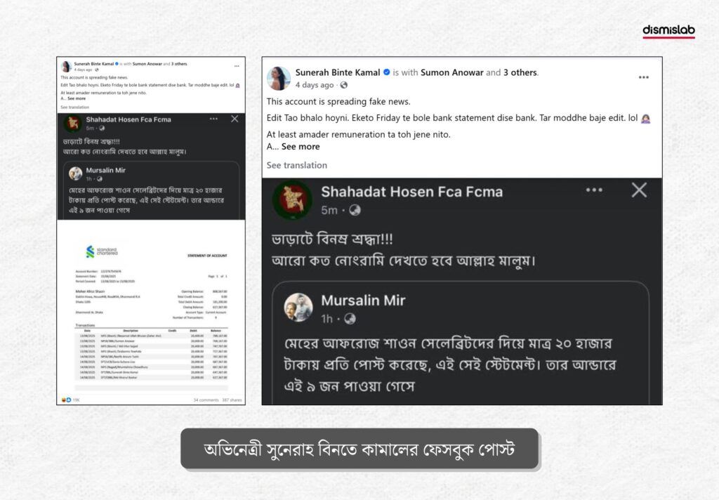 ফেসবুকের একাধিক পেজ (১, ২, ৩), গ্রুপ (১, ২) ও ব্যক্তিগত প্রোফাইল (১, ২, ৩, ৪) থেকে গত ১৫ আগস্ট ব্যাংকের একটি হিসাব বিবরণীর ছবি পোস্ট করা হয়। ক্যাপশনে লেখা, “১৫ই আগস্ট উপলক্ষে প্রতি পোস্টের দাম ২০ হাজার টাকা! ফান্ডিং করছে মেহের আফরোজ শাওন। তবে সুমন আনোয়ারের এতো ছোট পোস্ট দেওয়া উচিৎ হয় নি! উনাকে ১ হাজার টাকা দেওয়া উচিৎ ছিলো! এক বালতি সমবেদনা তাদের জন্যে যারা পোস্ট দিয়েও কোন টাকা পেলো না!।” একই হিসাব বিবরণীর ছবি পোস্ট করতে দেখা যায় ১ লাখ ১৯ হাজারের বেশি সদস্য থাকা “বৈষম্যবিরোধী ছাত্র আন্দোলন” নামের একটি গ্রুপে। সেই পোস্টের ক্যাপশনে বলা হয়, “শাওন আজকে যাদের যে সেলিব্রিটিদের ২০ হাজার করে দিয়েছে পোষ্ট করার জন্য।”