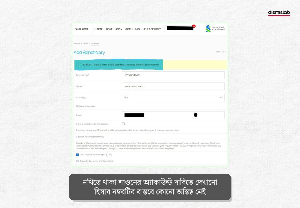 আবার একই ব্যাংকের অন্য হিসাবধারীরা ‘এসসি মোবাইল ব্যাংকিং’ অ্যাপের মাধ্যমে অভিনেত্রীর কথিত অ্যাকাউন্ট নাম্বার ‘১২২৩৭৬৭৫৪৫৬৭৬’-এ টাকা যোগ করতে চাইলে অ্যাপ থেকে সঠিক হিসাব নম্বর চাওয়া হয়। অর্থাৎ, নথিতে থাকা শাওনের অ্যাকাউন্ট দাবিতে দেখানো হিসাব নম্বরটির বাস্তবে কোনো অস্তিত্ব নেই।
