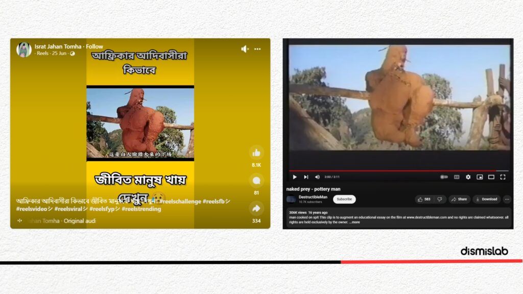 গত ২৫ জুন সামাজিকমাধ্যম ফেসবুকে এক ব্যবহারকারী একটি রিল পোস্ট করেন। ক্যাপশনে লেখা হয়: “আফ্রিকার আদিবাসীরা কীভাবে জীবিত মানুষকে খায় দেখুন।” রিলটিতে দেখা যায়, মানুষের মতোই দেখতে একটি অবয়বের সারা গায়ে কাদা মাখিয়ে বাঁশ বা মোটা খড়ির সঙ্গে বাঁধা হয়েছে। একদল আদিবাসী বাঁশটিকে ঘুরিয়ে জ্বলন্ত আগুনে পোড়াচ্ছে, একই সঙ্গে উল্লাস করছে।