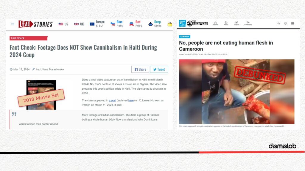 নরমাংসভোজ দাবিতে অপতথ্য ছড়ানোর ঘটনা নতুন নয়। গত মে মাসে হাইতিতে একটি ভিডিও ভাইরাল হয়। যেখানে দাবি করা হয়, ঘটনাটি ‘হাইতিয়ান ক্যানিবালিজম’ এর বড় প্রমাণ। ‘হাইতিয়ানদের একটি দল আস্ত একটা মানুষকে সিদ্ধ করে খেয়েছে’ দাবি করে পোস্টে লেখা হয়: “এখন আপনি বুঝতে পেরেছেন কেন ডোমিনিকানরা তাদের সীমান্ত বন্ধ রাখতে চায়।” এরপর লিড স্টোরিজ তাদের ফ্যাক্টচেক প্রতিবেদনে বলে, ভিডিওটি ২০২৪ সালের নয়, নরমাংস ভোজের দাবিটিও ভিত্তিহীন। আসলে ২০১৮ সালে নাইজেরিয়ার ওমামবালা চলচ্চিত্রের ভিডিও ধারণস্থলে সাজানো উপকরণ ও স্পেশাল ইফেক্ট দিয়ে মজার ছলে বানানো হয়েছিল এটি। ভিডিওতে সিনেমাটির সেট ও প্রপ ম্যানেজারকেও দেখা যায়। একই বছর ভিডিওটি সামাজিক মাধ্যম ফেসবুক, টেলিগ্রাম, হোয়াটসঅ্যাপসহ ক্যামেরুনের কিছু গণমাধ্যমে “ক্যামেরুন: বিচ্ছিন্নতাবাদী অঞ্চলে নরখাদকের দৃশ্য” দাবিতে প্রচারিত হয়। একই দাবিতে ক্যামেরুনের একজন মন্ত্রী সাক্ষাৎকারে বলেন, ক্যামেরুনের বিচ্ছিন্নতাবাদী দলে নরমাংস ভোজের চর্চা চলে। এরপর “দ্য অবজার্ভার” এবং ক্যামেরুনের একটি তথ্য যাচাইকারী প্রতিষ্ঠান স্টপব্লাব্লাক্যাম পৃথক ফ্যাক্টচেক প্রতিবেদনে জানায়, ভিডিওটি বাস্তব ঘটনাভিত্তিক নয়; এটি সিনেমার সেটে বানানো হয়েছে।