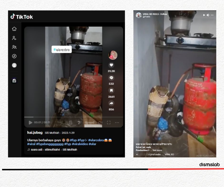 সামাজিক যোগাযোগমাধ্যম টিকটকে সাপের একটি ভিডিও প্রচার করে একে রাসেলস ভাইপার এবং ঘটনা বাংলাদেশের বলে বার্তা দেওয়া হচ্ছে। বেশ কিছু হ্যাশট্যাগের সঙ্গে ‘রাসেলস ভাইপার’ ও ‘বাংলাদেশ’ হ্যাশট্যাগ ব্যবহার করা হয় পোস্টে। তবে যাচাইয়ে রাসেলস ভাইপার তথা চন্দ্রবোড়া সাপের বাহ্যিক আকৃতির সঙ্গে ভিডিওতে থাকা সাপটির কোনো মিল পাওয়া যায়নি। গত বছর এই একই ভিডিওকে ভিত্তি করে ভারতের একাধিক গণমাধ্যম (১, ২) সংবাদ প্রকাশ করে। সেখানে ঘটনার উৎস উল্লেখ না করলেও ভিডিওতে থাকা সাপটিকে কোবরা বলে প্রতিবেদন প্রকাশ করে। তারও আগে ভিডিওটি ইন্দোনেশীয় ভাষায় একটি টিকটক একাউন্ট থেকে পোস্ট হতে দেখা যায়। ইন্সটাগ্রামের একটি ভিডিও পোস্টেও ইন্দোনেশিয়ার ভাষা ব্যবহার হতে দেখা গেছে।