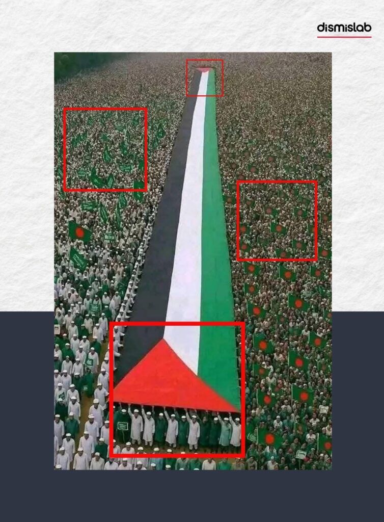 দ্বিতীয় ছবিতে এআইয়ের সংকেত আরও স্পষ্ট। যেমন, বাংলাদেশ ও সৌদি আরবের মতো দেখতে পতাকাগুলো দুই পাশে অবাস্তব রকমের নিখুঁতভাবে ও সমান দূরত্বে সাজানো, যা সাধারণত বাস্তব মিছিলে দেখা যায় না।