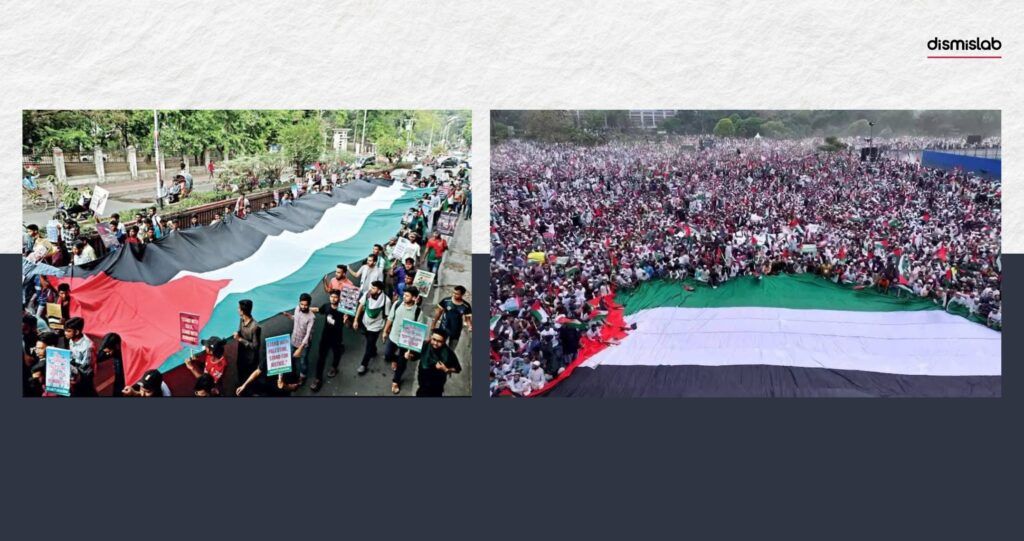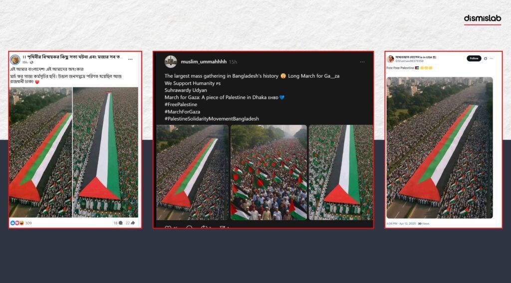 ফেসবুকে এই সমাবশ ও সেখানে মানুষের পতাকা নিয়ে হেটে যাওয়ার অনেক ছবি (১, ২, ৩) ও ভিডিও মেলে। একটি ছবিতে দেখা যায়, অনেকে একটি দীর্ঘ ফিলিস্তিনি পতাকা হাতে ধরে মিছিল নিয়ে যাচ্ছেন। সেখানে মানুষের পোশাক, মুখাবয়ব, পতাকা ধরার ধরন, রাস্তায় থাকা যানবাহন এবং আশপাশের পরিবেশ—সবকিছু স্বাভাবিক দৃশ্যের মতোই। এই ছবি তোলা হয়েছে দিনে, এবং রাস্তাটির পাশে গাছপালা ও রেলিংও দেখা যাচ্ছে। পাশাপাশি রাখলেই, বাস্তব ও এআই ছবির পার্থক্য ধরা যায়।