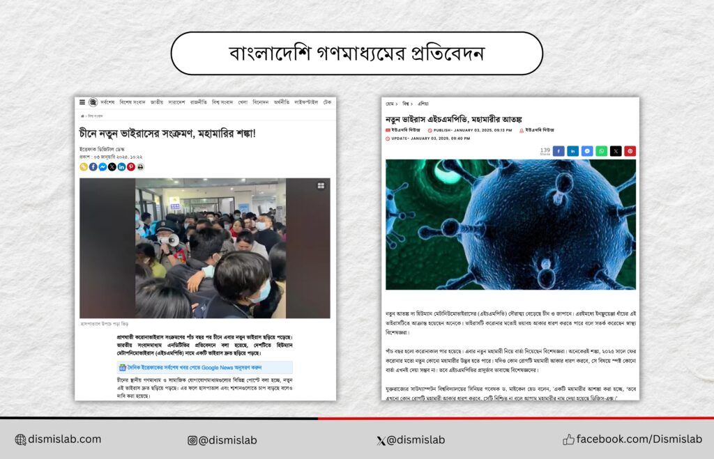যুগান্তরের প্রতিবেদনে ভারতের এনডিটিভিকে সূত্র উল্লেখ করে বলা হচ্ছে, “কোভিড-১৯ এর ভয়াবহতা এখনো ভুলতে পারেনি বিশ্ব। ঠিক এই সময়ে কোভিডের উৎপত্তিস্থল চীনে নতুন এক সংক্রামক ভাইরাসের প্রাদুর্ভাব দেখা দিয়েছে। এর নাম হিউম্যান মেটানিউমোভাইরাস (এইচএমপিভি)। বিভিন্ন প্রতিবেদন ও সামাজিক যোগাযোগমাধ্যমে প্রচারিত পোস্ট বলছে, হাসপাতাল এবং শ্মশানগুলোতে চাপ বাড়ছে ক্রমেই।” এটিকে নতুন ভাইরাস বলা হয়েছে দ্য ডেইলি ক্যাম্পাস, কালবেলা, ও কালের কন্ঠের প্রতিবেদনে।