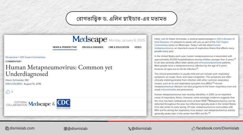 ডিসমিসল্যাব এই প্রতিবেদনে ফ্যাক্টচেক করেছে, এইচএমপিভি একটি “নতুন ভাইরাস” কিনা এবং এটি থেকে “মহামারির শঙ্কা” আছে কি না। যাচাইয়ে দেখা গেছে, এইচএমপিভি নতুন কোনো ভাইরাস নয়। বিশেষজ্ঞদের মতে ভাইরাসটি অনেক আগে থেকেই আছে এবং এই ভাইরাসে আক্রান্তের ঘটনা আগেও ঘটেছে। ভাইরাসটির সাম্প্রতিক প্রাদুর্ভাব নিয়ে সতর্ক থাকার পরামর্শ দিলেও এটি কোভিডের মতো বৈশ্বিক মহামারি হয়ে ওঠার আশঙ্কা নেই বলেও মত দিয়েছেন বিশেষজ্ঞরা।