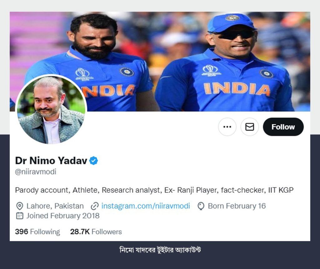 “ড. নিমো যাদব” নামের একটি ভেরিফায়েড অ্যাকাউন্ট থেকে এমন টুইট করা হয়। তবে অ্যাকাউন্টটির ইউজারনেম নিরব মোদি (@niiravmodi)। এটি একটি ছদ্ম নাম। আসলে নিরব মোদি হচ্ছেন একজন ভারতীয় ব্যবসায়ী; যিনি প্রায় ২ বিলিয়ন ভারতীয় রুপি পাচারের দায় নিয়ে লন্ডনে পালিয়ে গিয়েছিলেন। ১৯ সালের মার্চ থেকে তিনি লন্ডনের ওয়ান্ডসওয়ার্থ জেলে আটক আছেন।