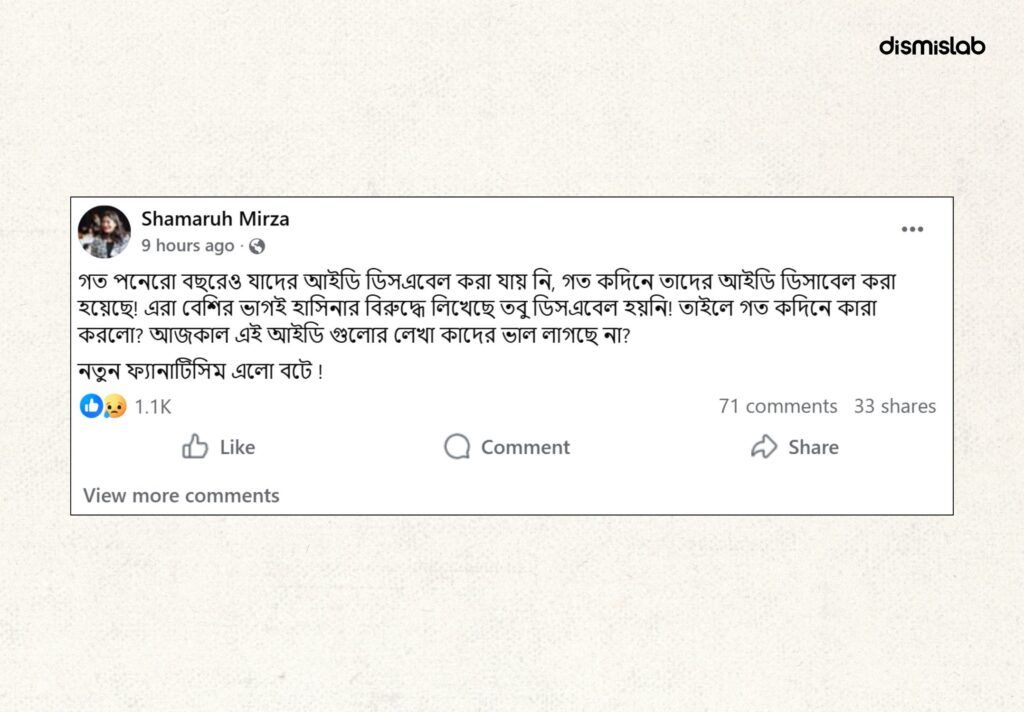 ফাহাম আব্দুস সালামের সহধর্মিনী ও বিএনপির মহাসচিব মির্জা ফখরুল ইসলাম আলমগীরের কন্যা ড. শামারুহ্ মির্জা তার ফেসবুক স্ট্যাটাসে অভিযোগ করেন- “গত পনেরো বছরেও যাদের আইডি ডিসএবেল করা যায় নি, গত কদিনে তাদের আইডি ডিসাবেল করা হয়েছে! এরা বেশির ভাগই হাসিনার বিরুদ্ধে লিখেছে তবু ডিসএবেল হয়নি! তাইলে গত কদিনে কারা করলো? আজকাল এই আইডি গুলোর লেখা কাদের ভাল লাগছে না? নতুন ফ্যানাটিসি[জ]ম এলো বটে !”