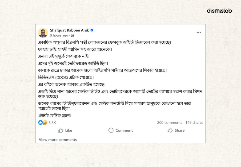 বিশ্লেষক ও রাজনৈতিক পর্যবেক্ষক শাফকাত রাব্বী অনিক তার ফেসবুক স্ট্যাটাসে অভিযোগ করেন, “একাধিক পপুলার বিএনপি পন্থী লোকজনের ফেসবুক আইডি ডিজাবেল করা হয়েছে। ফাহাম ভাই, মাহদী আমিন সহ আরো অনেকে। এনারা এই মুহূর্তে ফেসবুকে নাই। এদের দুই জনেরই ভেরিফায়েড আইডি ছিল। কালকে রাত্রে ঢাকার অনেক গুলো আইএসপি সাইবার আক্রমণের শিকার হয়েছে। ডিডিওএস (DDOS) এটাক খেয়েছে। এর বাইরে অনেক হ্যাকার একটিভ হয়েছে। এআই দিয়ে নানা ধরনের ফেইক ভিডিও এবং ভোটারদেরকে আগামী ভোটের ব্যাপারে হতাশ করার মিশন শুরু হয়েছে।”