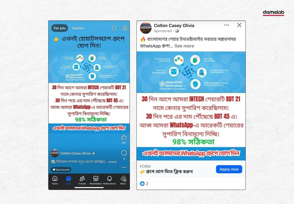 বামের বিজ্ঞাপনটি ৬ সেপ্টেম্বরের; এটি সিবিএল নামসহ একটি হোয়াটসঅ্যাপ গ্রুপের প্রচারণা চালায়। ডানের বিজ্ঞাপনটি চলেছে ২৫ সেপ্টেম্বর। গ্রাফিক্স কার্ড ও তথ্য একই, কিন্তু এর অ্যাপ্লাই নাও বাটনে অনুসরণ করে ব্র্যাক নামসহ একটি হোয়াটসঅ্যাপ গ্রুপ পাওয়া যায়। দুটো বিজ্ঞাপনই চলেছে কোল্টন কেসি অলিভিয়া নামের একটি ফেসবুক পেজ থেকে।